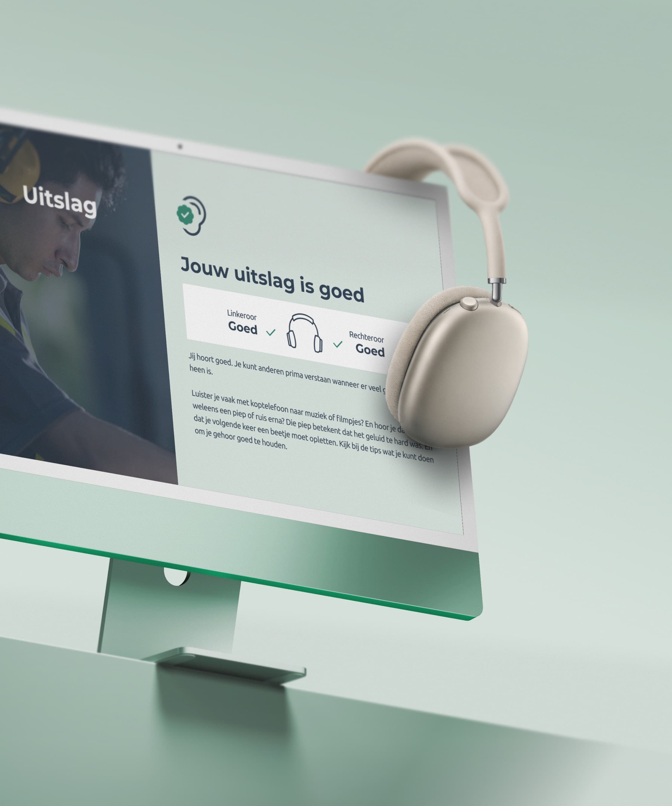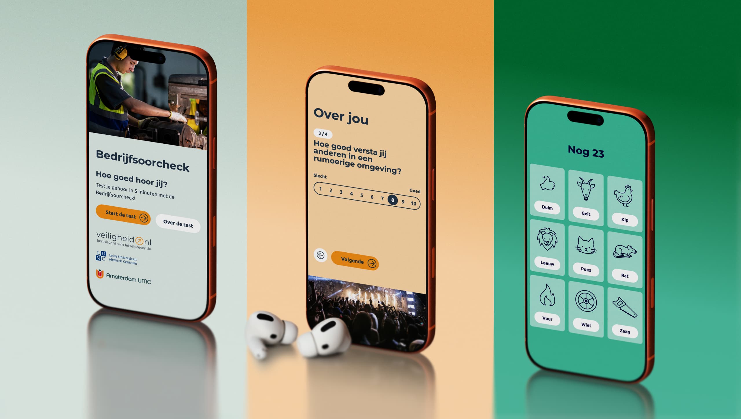 Eén moderne applicatie met drie ingangen: Oorcheck (12–25 jaar), Nationale Hoortest (25+), Bedrijfsoorcheck (16+ in lawaaiberoep)